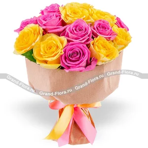 Лучезарность – букет с ирисами, альстромериями и хризантемой
