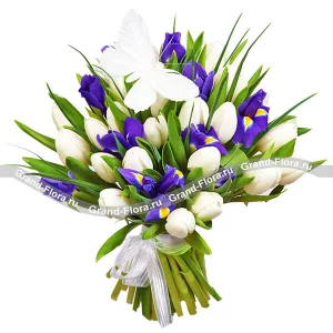 Ласковое воспоминание - букет из белых тюльпанов и кустовых роз