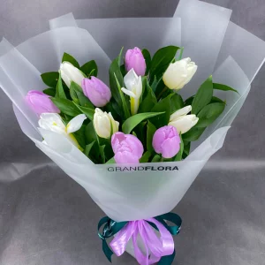 Нежность в лепестках - букет из белых тюльпанов и кустовой розы