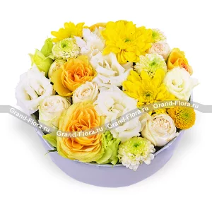 Твой апрель - коробка с желтыми кустовыми розами и хризантемами