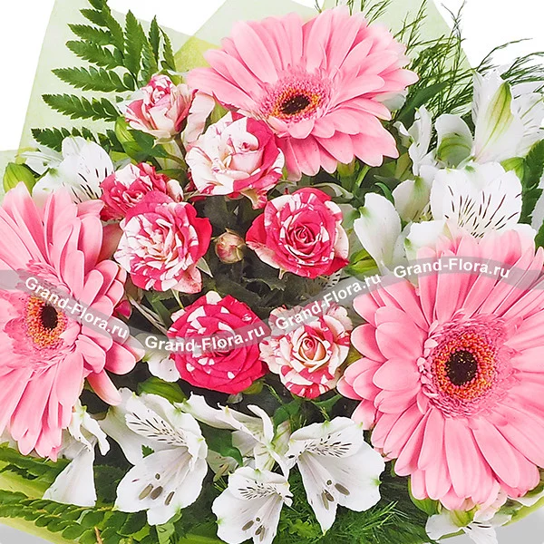Если вы хотите признаться в своих чувствах и поделиться со своей девушкой теплотой своего сердца – лучший способ заказать букет с доставкой. Оригинальная флористическая композиция выполнена в сдержанных тонах. Красоту розовых гербер и пестрых роз по достоинству оценят молодые девушки. Чистоту и нежность придают восхитительные альстромерии, которые даже в срезанном виде продолжают цвести и пахнуть.