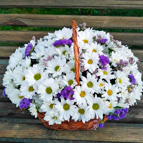 Букет из хрупких цветов, помещенный в плетеную корзинку, является не только чрезвычайно привлекательным, но и оригинальным презентом. Изящные белоснежные хризантемы подойдут к любому торжеству, будь то свадьба друзей, юбилей или день рождения любимой девушки. Также букет станет великолепным решением для вручения маме или сестре на 8 марта.