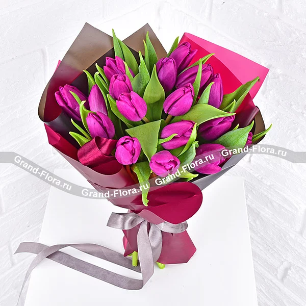 19 тюльпанов: тюльпаны фиолетовые - 19 шт., упаковка , лента.