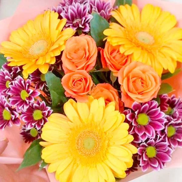 Аккуратный и стильный  букет непременно вызовет восхищение своего счастливого обладателя. Сочетание оранжевых кустовых роз и фиолетовой хризантемы на фоне крупных цветков желтой герберы подчёркнуто насыщенно-зелёными листьями салала. Совершенство можно подарить, когда оно воплощено в цветах.