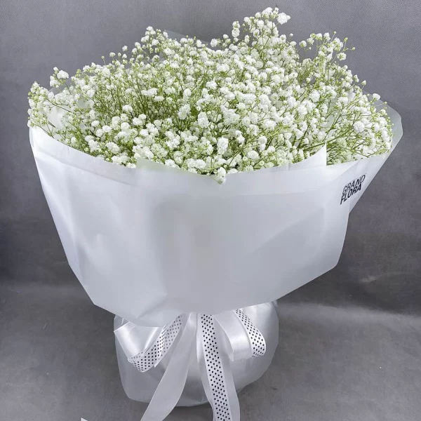Букет - это инновационный и оригинальный букет, который состоит из гипсофилы. Гипсофила это цветок котрый имеет длительный срок хранения. Букет оформлен в упаковку, которая имеет оригинальный дизайн в виде гороха. Этот дизайн добавляет букету дополнительную интересность и оригинальность, делая его идеальным для подарка или декора. Букет может быть использован в различных ситуациях, он идеален как как подарок на день рождения, на конференции или для декора интерьера. В зависимости от предпочтений заказчика, букет может быть сделан в различных размерах и с различным количеством цветов.